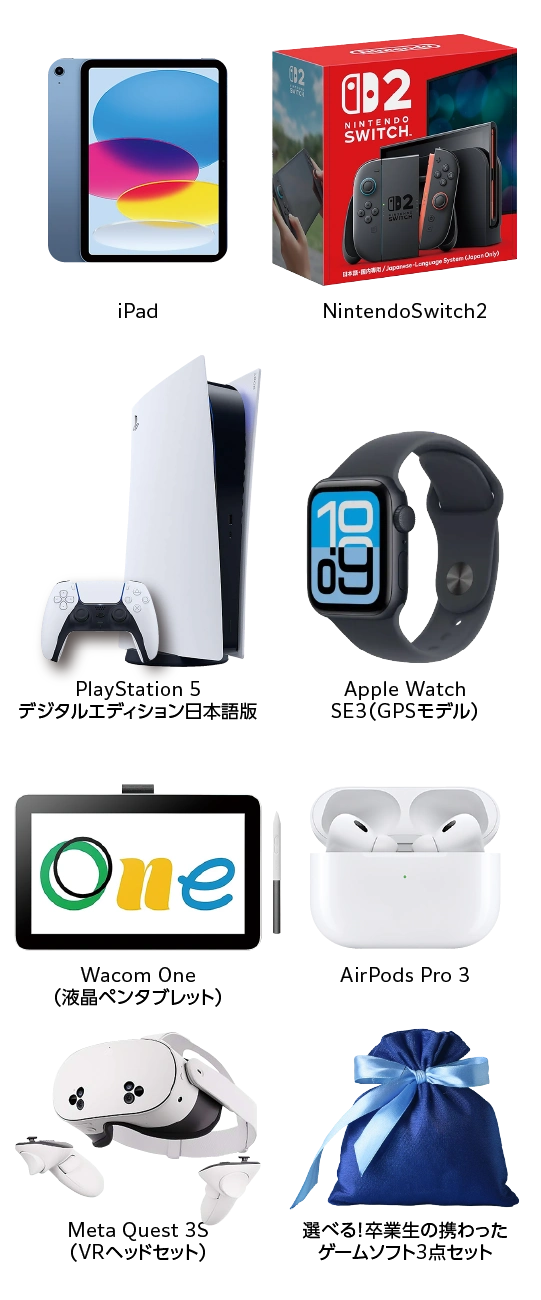 優勝者にはゲーム機やiPad,ペンタブレットなど,豪華賞品の中から希望の賞品を1つプレゼント!
