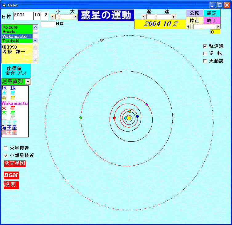 (8399) Wakamatsu = 1994 AD 若松謙一 Discovered 1994 Jan. 2 by T. Kobayashi at Oizumi. Ken−ichi Wakamatsu (b. 1942) is a professor at Gifu University and serves as the vice−president of the Astronomical Society of Japan. He has studied the structure and dynamics of clusters of galaxies in optical and radio ranges, and he also worked on an 11-m radio telescope for e-VLBI network in Japan. |