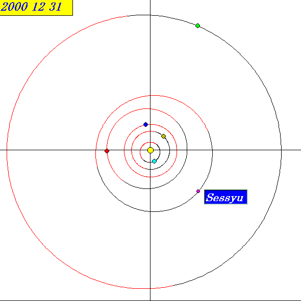公転周期: 3.30年 絶対等級:13.90等 軌道線は内側から水星・金星・地球・火星・Sessyu・木星で,赤色は黄緯が正(画面の手前)であることを表す。