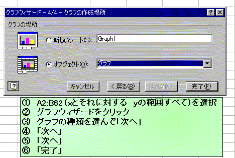 x,y の表を作ってグラフウィザードを使いグラフを作成する。