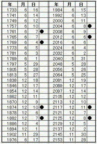 太陽と地球の間に割り込んでくる天体は月,水星,金星だけ。金星の太陽面通過はそのうちで最も珍奇な現象で,これまでの観測例は4回しかありません。金星が太陽に重なるほど接近するのは,1700年から2200年までに50回起こっていますが,前面通過は●印のわずか8回のみで他は背面通過です。しかも8年間隔のペアで起こります。