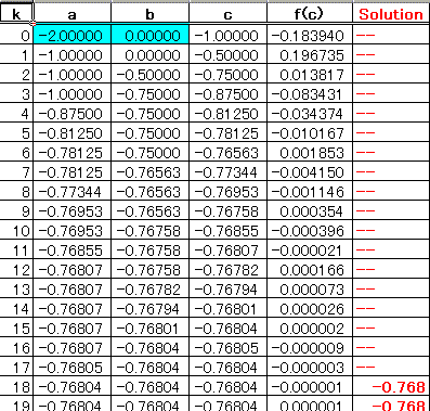 x=−0.76804 と求まる。これは上図においてy=f(x) とX軸との交点のうち左側のものである。初期値としてx=2 とすると右側の解 x=1.67835 が得られる。 εは10
