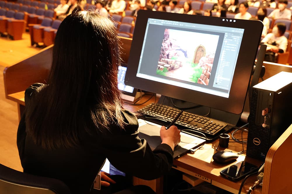 当日は,ゲーム・アニメ業界で活躍され, KCGで「キャラクターイラスト実習」や「グラフィックツール入門」などの授業を担当している須磨幸子先生によるライブペインティングを開催。『コンセプトアート』をテーマに,火山の写真や荒野の風景画に扉の写真を合成し,まるでそこに別の世界への扉が存在するかのように違和感なく仕上げていく工程を,解説をしながら実演しました。コンセプトアートは,ゲームの企画書などで,プログラマなどプロジェクトのメンバーに,言葉だけでは伝えきれない,世界観のイメージを伝える大切なもの。参加者は興味深そうに見入っていました。アート・デザイン学系主任の藤田啓輔先生が聞き役となり,アーティストとして求められるスキルやゲーム業界の仕事について,貴重なお話しもしてもらいました。