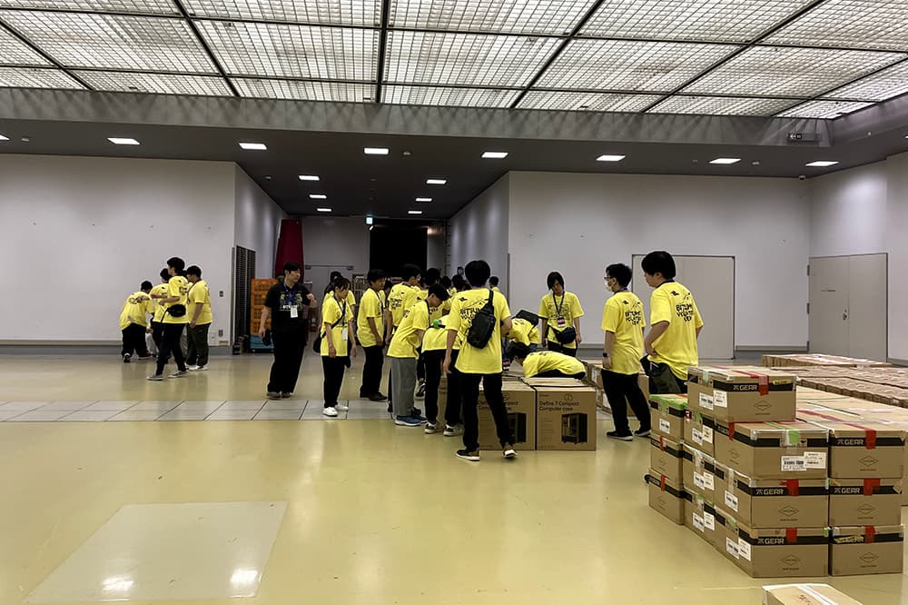 スタッフはイベント前日に会場に届く荷物の仕分け・運搬,ブースで使用するPCなどの貸出機材のセッティング,終了後はそれらの片付けや荷物の整理などを担当します。当日は会場内の人の流れに応じて柔軟に場内の整理・誘導が重要な役割。学生スタッフは目的を常に意識しながらどうすべきかを自分達で考え,各持ち場のチーム同士で調整しながら対応しました。
